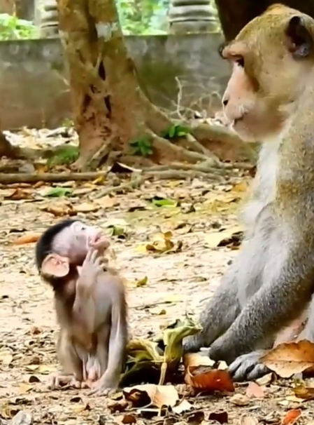 Lumo was only a few weeks old. His fur was still thin and soft, and his movements were clumsy, uncertain. Usually, a baby monkey would cling tightly to its mother’s chest, feeling safe with the steady rhythm of her heartbeat. But on this day, something felt different. Lumo’s mother had gone searching for food, leaving him briefly in the care of his father, a strong adult monkey named Karo.