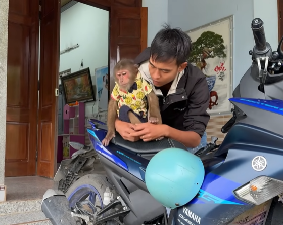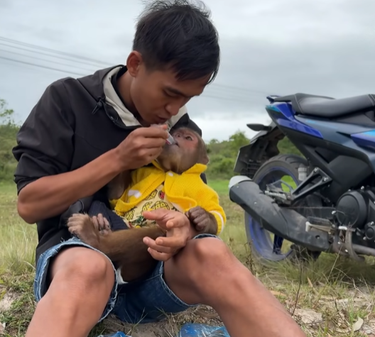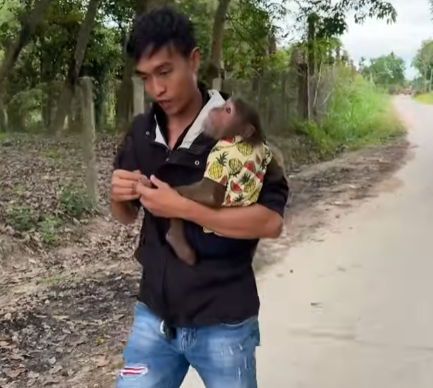 Despite being sick, Cutis insisted on following Dad outside to feed the monkeys. His steps were unsteady, his head heavy, but his confidence was completely untouched. He grabbed a basket that was clearly too big for him and marched forward like a hero going into battle.