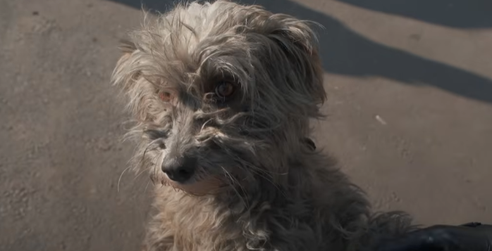 Her fur was once white, perhaps soft and bright like fresh cotton. Now it was stained gray with dust and rain, matted into painful knots that pulled at her skin. One of her hind legs lay twisted beneath her at an unnatural angle, swollen and unmoving. Every breath she took was shallow, careful, as though even breathing hurt. Yet the deepest pain was not in her body—it lived in her eyes.
