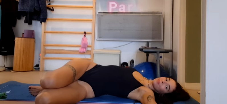 Gentle stretches for the legs, back, and hips help restore mobility and ease tension. Breathing remains slow and controlled, reinforcing relaxation and recovery.