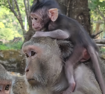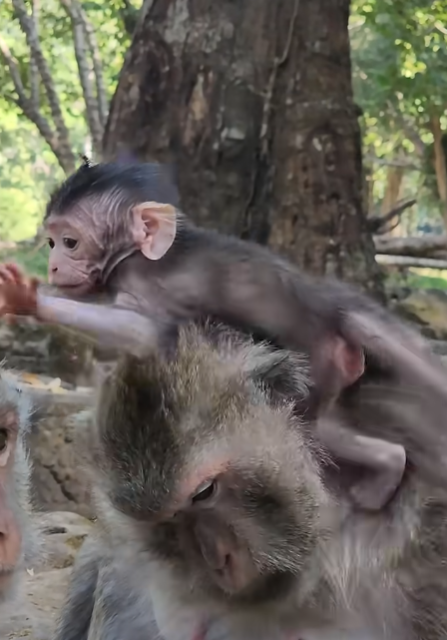 Lilo was the kind of baby monkey that seemed to embody pure joy. His small brown fur shimmered in the sunlight, and his bright, curious eyes sparkled with mischief. From the moment he opened his eyes, he had clung to Mira, the gentle long-tailed macaque who had become his entire world. Unlike other baby monkeys who might shyly cling to their mothers’ bellies, Lilo had developed a unique habit: he loved to sit atop Mira’s head, balancing skillfully as she moved through the trees. This playful behavior quickly became a daily spectacle that drew admiration from other members of the troop and enchanted anyone who observed them.