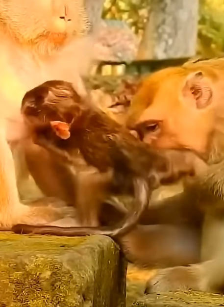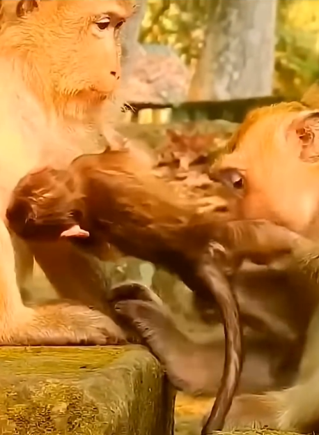 Physical actions can also escalate. If an older monkey or predator attempts to harm or intimidate the baby, the mother may lash out with swift strikes, bites, or grappling maneuvers. Observations in the wild show that mother monkeys rarely hesitate when their infant’s safety is at risk. Their reactions are precise, coordinated, and often successful in neutralizing threats.