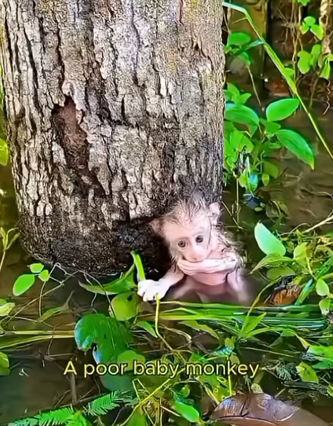 Following the sound, Dara pushed aside low branches and tall grass until he reached a muddy patch near the water. There, clinging to a fallen log, was a baby monkey—tiny, shaking, and completely alone. Its eyes were wide and glossy, scanning the trees as if searching for something that wasn’t there anymore. Its little hands gripped the wood desperately, as though letting go might mean disappearing forever.