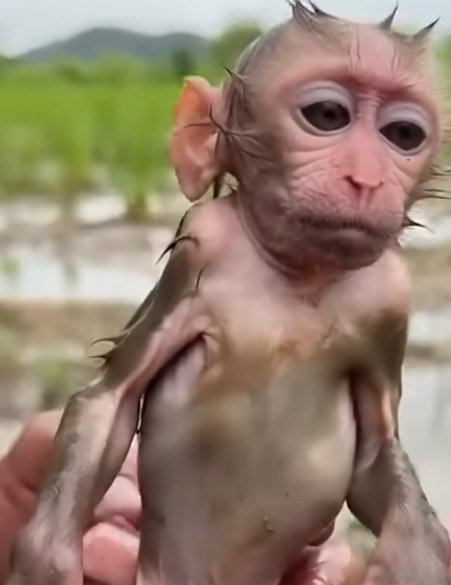 The baby monkey had likely been separated from its mother too early. In the wild, young monkeys depend entirely on their mothers for warmth, nutrition, protection, and emotional comfort. Without that constant care, even a short separation can weaken them quickly. This baby’s thin limbs and quiet cries told a story of hunger and loneliness. Still, there was something unmistakable in its eyes—a small spark that refused to go out.