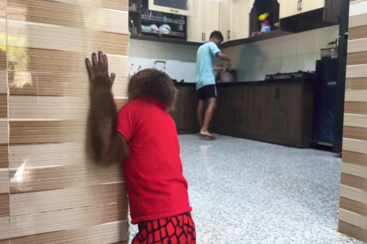 CUTIS immediately followed Dad around the house like a tiny shadow, watching every movement with suspicious intensity. Dad tried to ignore it, pretending not to notice the small figure trailing behind him. He picked up his wallet. CUTIS picked up a random object too. He checked his phone. CUTIS pretended to check something invisible in one hand.