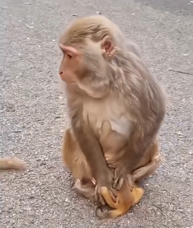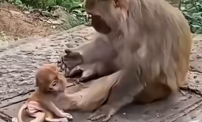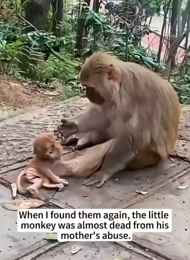 Hidden among the roots of a large tree was a tiny baby monkey, shaking and alone. Its fur was dusty, its eyes wide with confusion and fear. Nearby, the troop moved on, and among them was the baby’s own mother. Instead of comfort, the little one had been pushed away—ignored, chased off, and left behind. In the wild, this sometimes happens when a mother is overwhelmed, stressed, or unable to care for a weak or different baby.