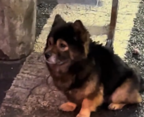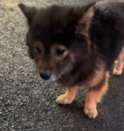 He was lying on the cold ground, tucked tightly into himself, ribs pressing against thin fur. His coat was dirty, matted in places, and his body looked too small for his head, as if hunger had slowly stolen pieces of him. He didn’t bark. He didn’t run. He didn’t even lift his head.