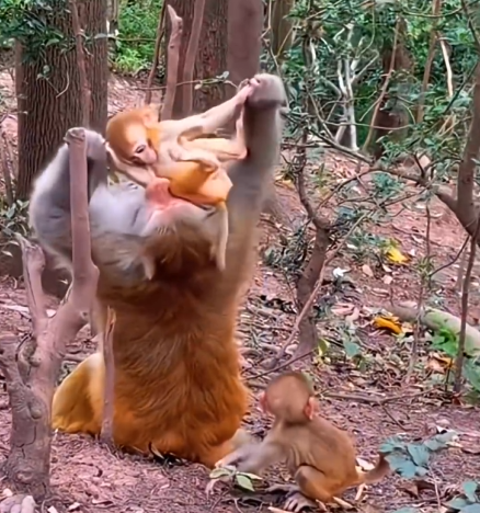The other monkeys in the clan watched in awe. Some of the younger females, soon-to-be mothers themselves, observed closely, learning from the way the happy mother interacted with her baby. The older males, often gruff and serious, paused and glanced over, their stern expressions softening slightly at the infectious joy radiating from the duo. Even rival monkeys from nearby clans seemed to hesitate before venturing too close, perhaps instinctively sensing the strong bond between mother and child.