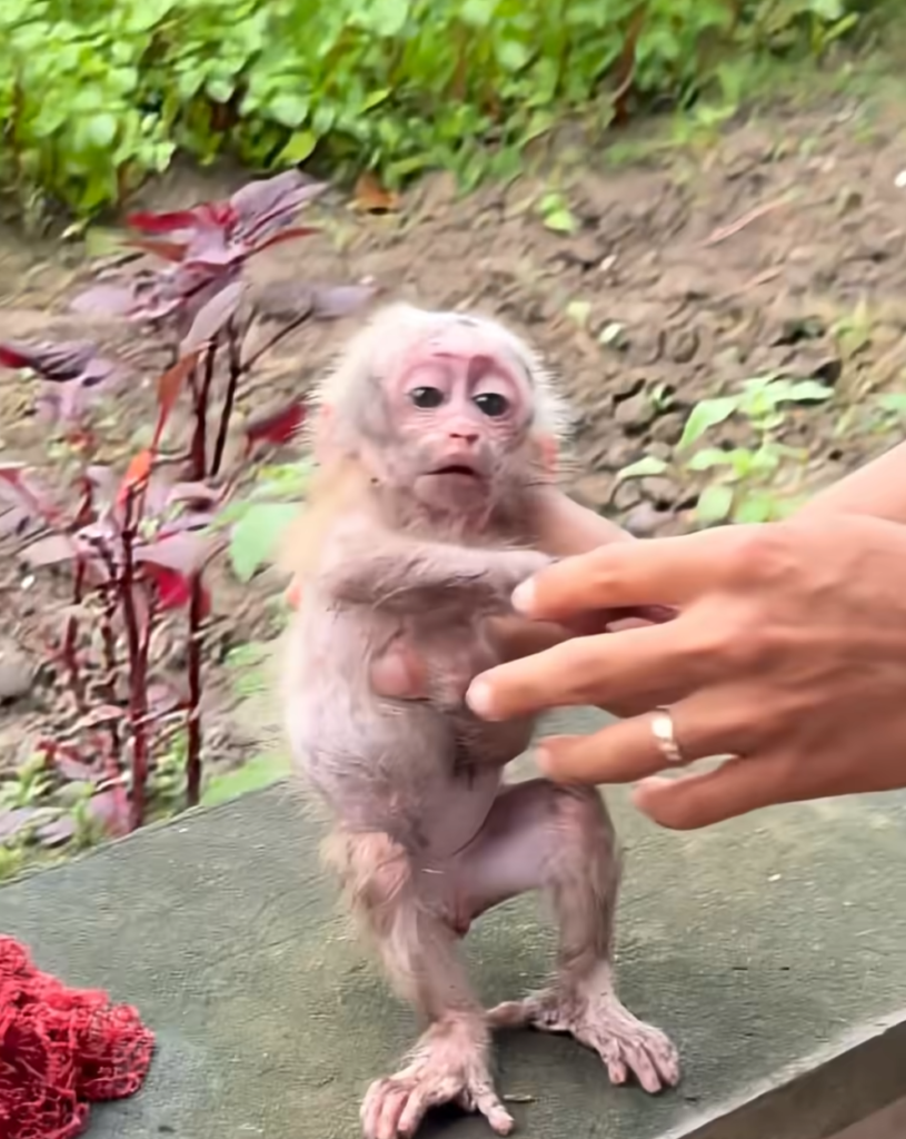 The poor abandoned monkey hesitated. Trust did not come easily anymore. But hunger was strong, and something in their voices felt safe. He crept forward, step by shaky step, and reached out. His fingers closed around the food, and he ate quickly, almost desperately.