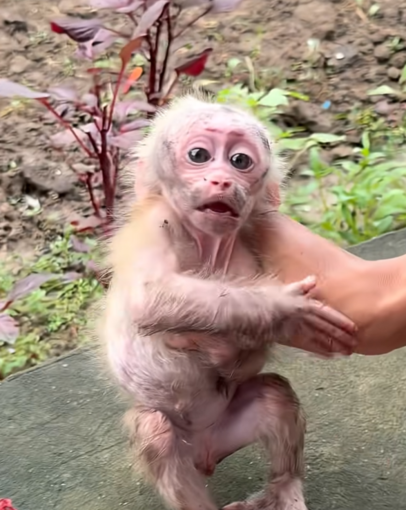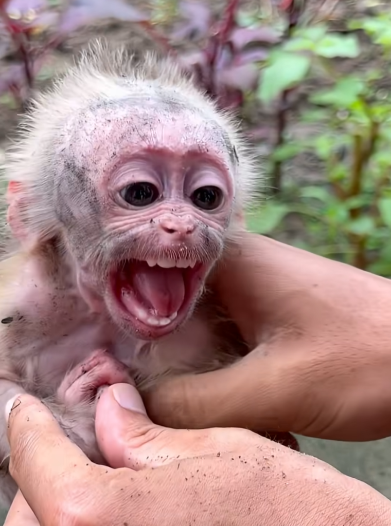The little monkey sat alone at the edge of the forest, curled into a tight ball, his thin arms wrapped around his small body. The world felt far too big and far too quiet. Just days ago—maybe hours, he couldn’t tell—his life had been filled with familiar sounds: his mother’s breathing, the rustle of leaves as she moved, the gentle touch that told him he was safe. Now, there was nothing but silence. He was a poor abandoned monkey, and he didn’t understand why he was alone.