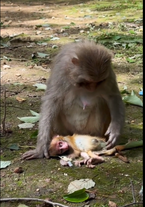 An older female monkey, experienced and calm, approached slowly. She held a small piece of fruit she had managed to find. Without aggression, she placed it near Baby Monkeyâs mother.