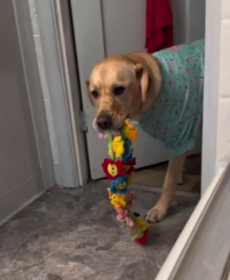 Over time, Buddy’s reputation grew. Friends came over just to watch him interact with everyday objects. Children laughed as he proudly paraded around with a dustpan. Guests were greeted not with barking, but with Buddy presenting them a random item—a slipper, a spoon, or occasionally a toilet paper roll—like an offering.