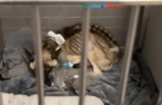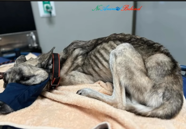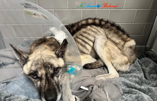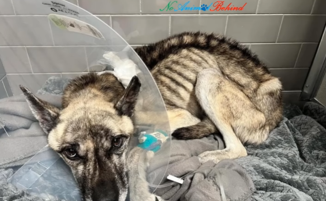 He had not always been alone. At some point in his life, he had known a home, a routine, and perhaps even a name. But those memories were buried beneath weeks—maybe months—of hunger and neglect. His once-strong body had been reduced to skin and bone. Every rib showed. His hips jutted sharply, and his fur hung dull and lifeless against his frame. Hunger had hollowed him out, leaving only weakness behind.