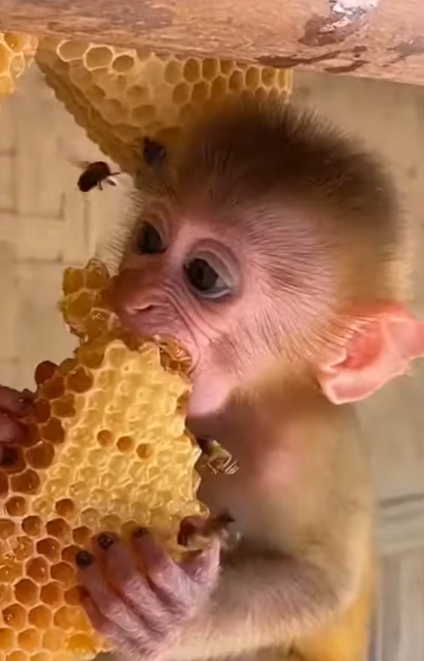 Nearby, an older presence watched closely, calm and attentive. Experience knew what curiosity didn’t: that bees deserve space and respect. A gentle movement guided the baby monkey slightly away, not with fear or urgency, but with quiet care. The baby monkey resisted for just a second—eyes still locked on the honey—then relaxed, trusting the guidance.