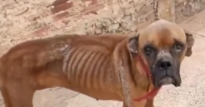 The dog stood at the edge of the road like a shadow that had forgotten how to move on. His body was so thin it barely looked real—skin stretched tightly over sharp bones, ribs rising and falling with each shallow breath. His legs trembled beneath him, not from cold, but from exhaustion so deep it had become part of him. When the man stopped his motorcycle nearby, the dog lifted his head slowly and looked at him. In his eyes was no anger, no fear—only a quiet, desperate plea for help.