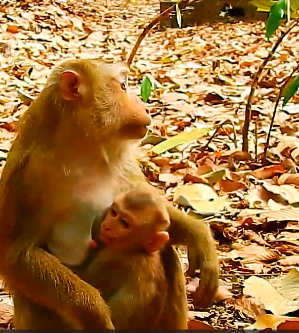 Eventually, the older juvenile lost interest in the fig and moved on, realizing that the baby monkey’s determination—and perhaps the subtle warning from the mother—was too formidable. The infant’s chest heaved, its tiny body still tense, but it had successfully defended its prize. A sense of triumph mingled with lingering frustration, and the baby monkey began to calm gradually, comforted by the mother’s grooming and the reassuring presence of the troop.
