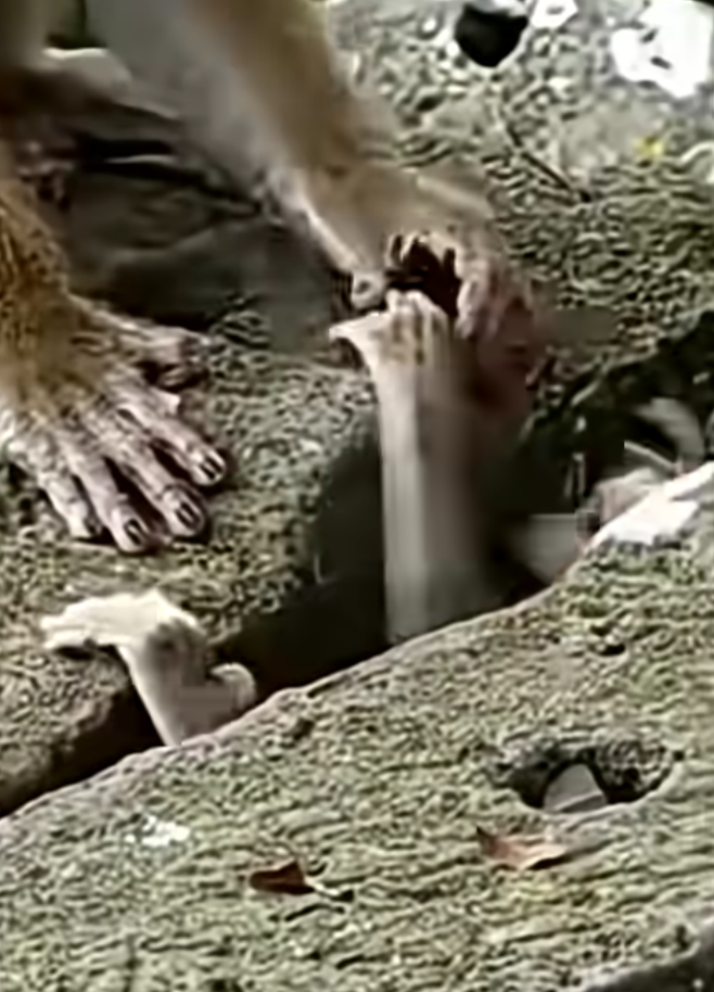 He was small, barely old enough to cling tightly to his mother’s fur. Curious and playful, the little monkey had wandered too close to a cluster of tall rocks near the stream. The stones were ancient, cracked by time and weather, forming narrow crevices hidden by shadows and fallen leaves. One careless step was all it took.