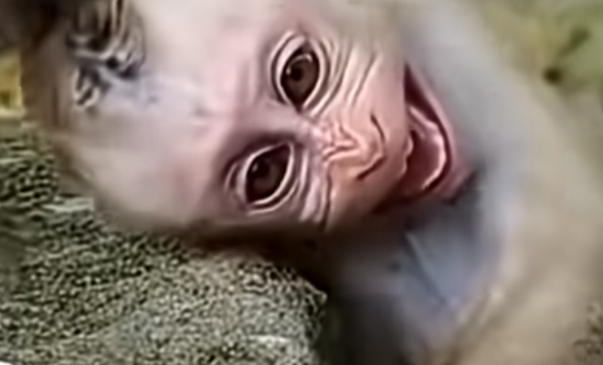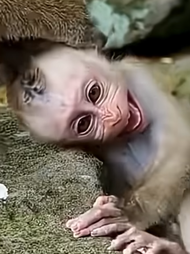 The baby monkey felt movement above him. Fresh air touched his face. He whimpered softly, confused but sensing change. A gentle hand reached down, steady and warm, supporting his small body.