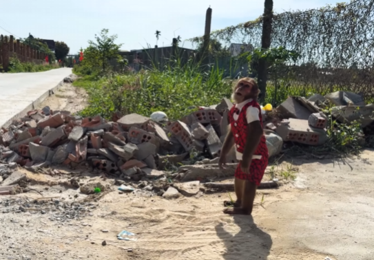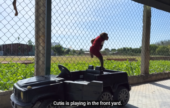 Then came a curious dog. The dog barked loudly at first, but CUTIS was fearless. He climbed a small rock and waved dramatically. “Relax! We’re just out for a walk!” The dog tilted its head, sniffed the air, and finally trotted alongside for a few steps before deciding the monkeys and goats were probably too chaotic to follow for long.