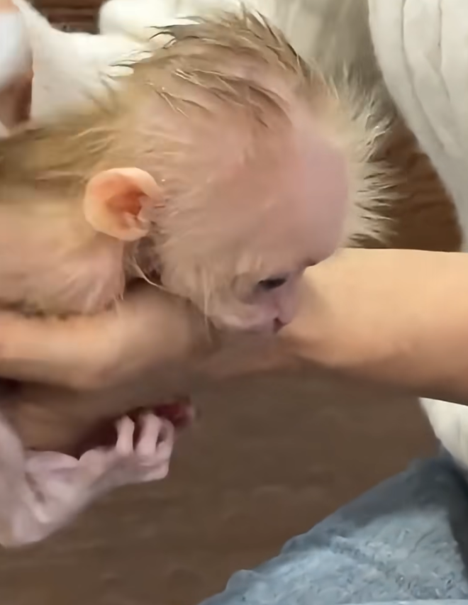 Gentle hands lifted him—not with confidence, but with respect. No squeezing. No rushing. Just patience. The baby monkey responded instantly, curling his fingers tightly around one soft finger, holding on as if he already understood how important that touch was.