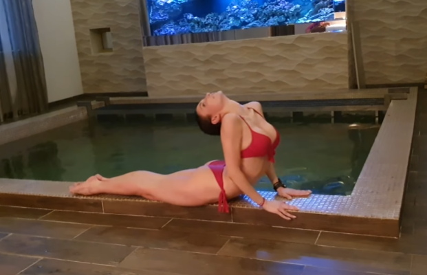 The video shifted into floor work after that. Seated stretches, spinal twists, shoulder openers. The pace remained unhurried. Contortion by the pool wasn’t about spectacle—it was about harmony with the environment.