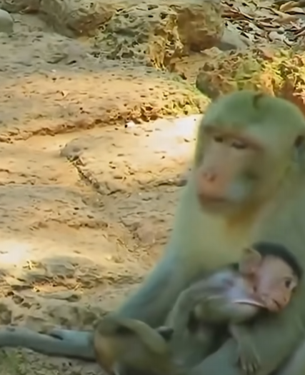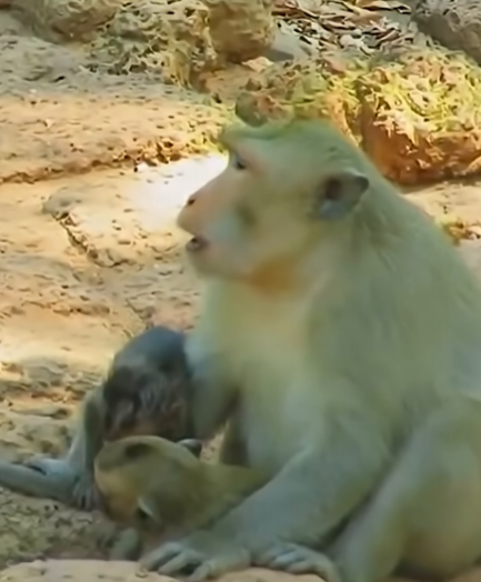 Distracted by a group of older monkeys playing nearby, the baby monkey reached out instinctively, seeking warmth and support. Its tiny fingers landed on the wrong mother—a female who was not its own. She was older, less patient, and more focused on her own infant clinging tightly to her side. Startled, she recoiled, jerking herself away from the unexpected weight pressing against her fur.