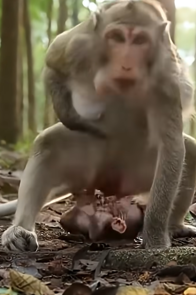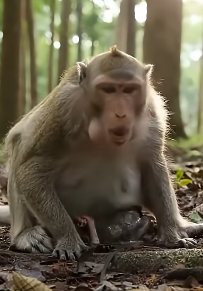 As labor begins, the mother monkey becomes more still and focused. Her body knows what to do. Guided by instinct passed down through countless generations, she prepares herself for the arrival of her baby. There is no hospital, no tools, no words of reassurance—only her strength, her experience, and the rhythms of nature. The environment around her may be simple: grass, branches, earth, and sky. Yet this simplicity is enough.