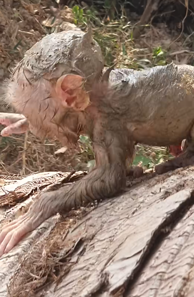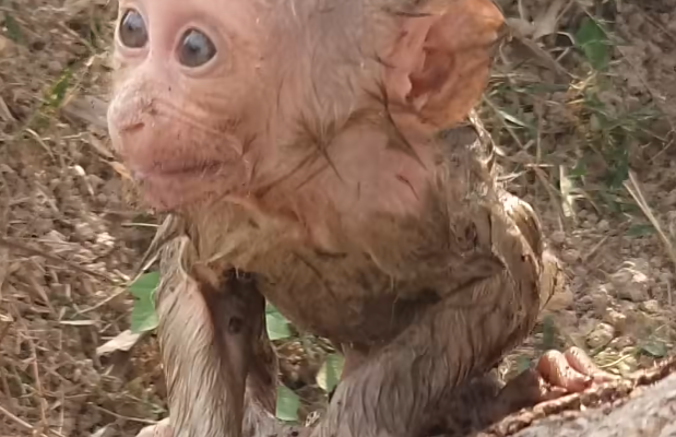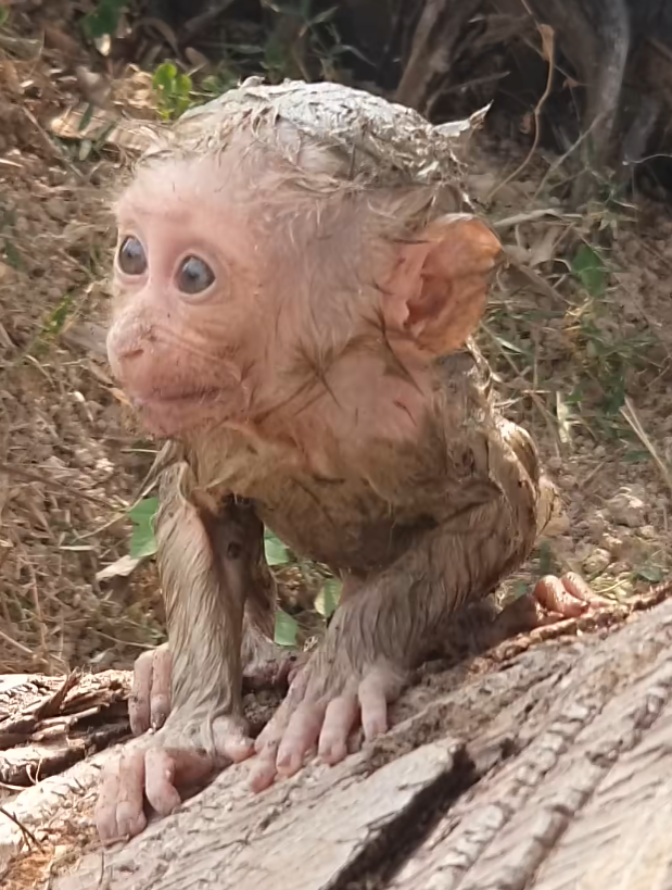 The baby monkey was tiny—so small that the world around him seemed endless. His fur was still thin and damp, clinging to his fragile body. Bits of mud and leaves stuck to him, evidence of how fresh his arrival into the wild truly was. His wide eyes reflected curiosity and uncertainty, blinking slowly as he tried to understand where he was.