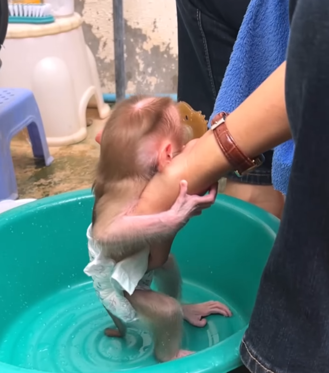 The room was quiet and warm, filled with soft light and the calm feeling that comes before something new begins. Monkey Jumie sat close to Mom, his tiny body curled slightly as he watched her every move. He didn’t know it yet, but today was special. Today would be his very first bath.