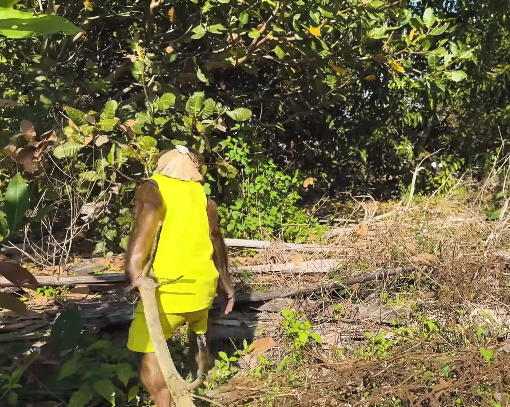 Cutis held back a giggle, squeezing her squeaky toy. Then, in the blink of an eye, she jumped out from behind the tree, squeaking loudly. “Boo!” she shouted.