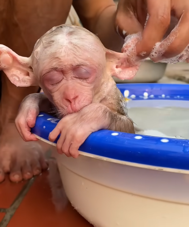 Dad checked the water with his hand, making sure it was just right—not too warm, not too cool. He had learned that gentleness mattered more than speed. The baby monkey watched closely, his big eyes following every movement. New things always made him nervous, but Dad’s calm presence helped him stay still.