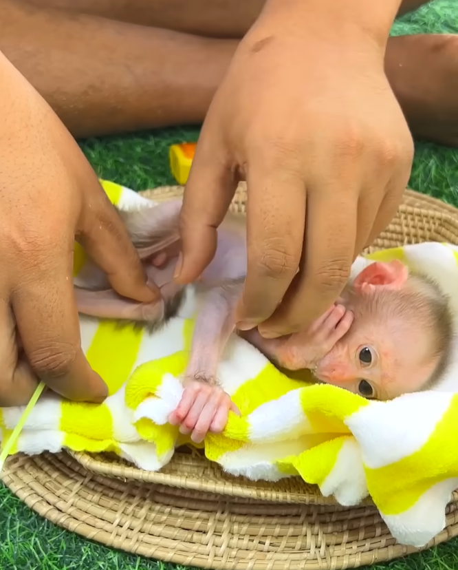 The baby monkey rested his head against a shoulder, fingers curling lazily into the fabric of the towel. The world felt quieter now. Softer. Safer. His eyelids drooped as he listened to gentle voices and felt steady breathing beneath him.