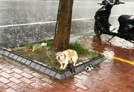 As the day dragged on, the rain intensified. Water began to seep into the cardboard box. The puppies whimpered softly, their cries barely audible beneath the rain. The mother dog rushed back, curling her body around them, shielding them with everything she had. Her own body shook from cold, but she stayed still, letting them burrow into her warmth.