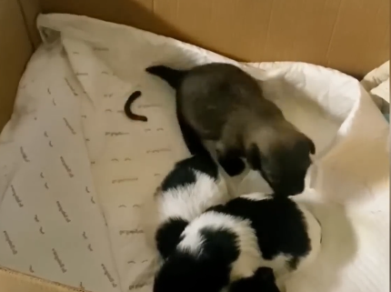 They were tiny, eyes barely open, bodies pressed together for warmth. Their mother had lined the box with scraps of fabric and old newspapers, anything she could find to keep them dry. Every few minutes, she turned back to check on them, nudging them gently with her nose before returning to her post near the curb.