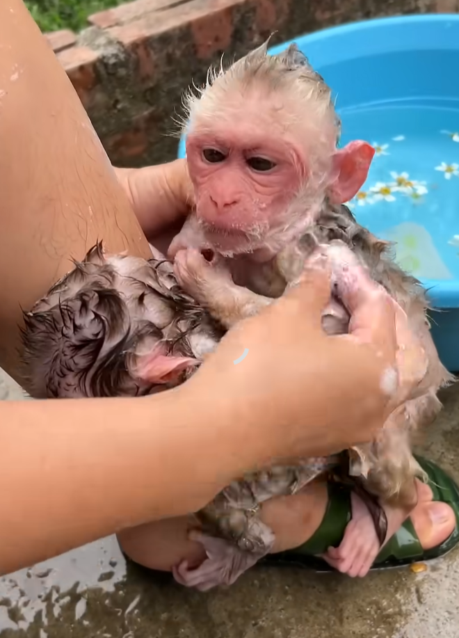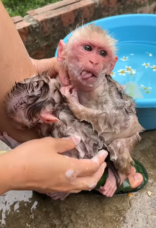 Both monkeys were tired now, their earlier energy replaced by calm contentment. Bath time had started with curiosity, fear, and a little drama, but it ended with warmth, comfort, and trust.
