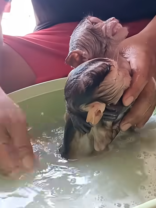After washing their bodies, Dad rinsed their tiny hands and feet again, letting the clean water flow over them one last time. The bold baby splashed again, clearly enjoying the experience now, while the shy baby clung but no longer trembled. Both were clean, their fur darker and shinier from the water, their little faces brighter.