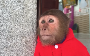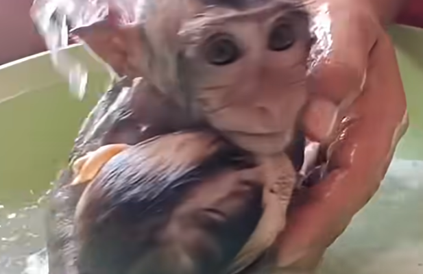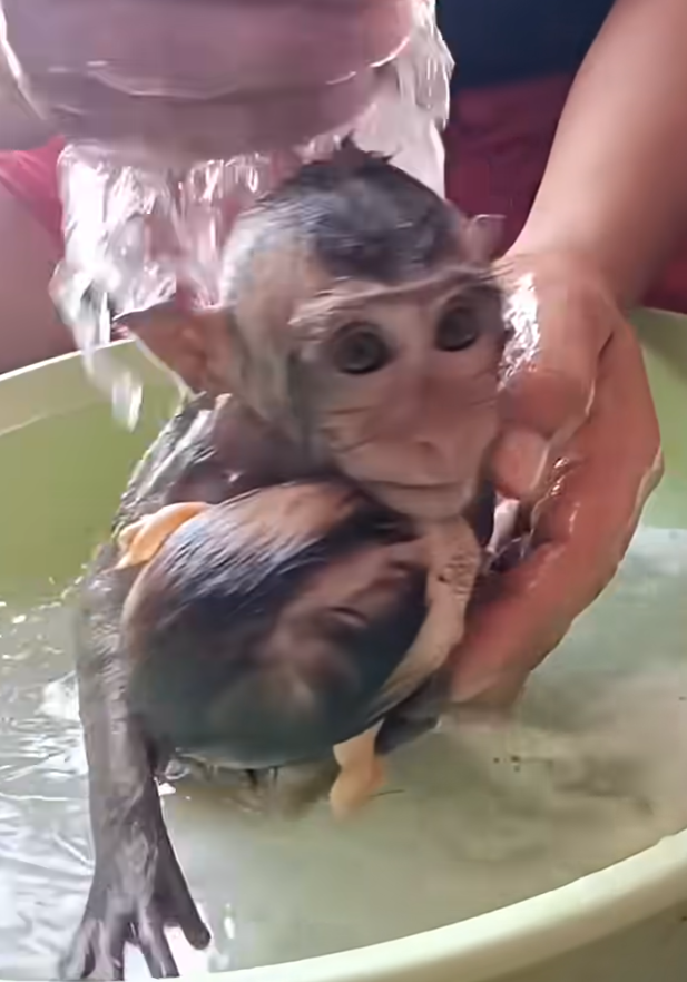 The morning sun filtered gently through the trees, turning the forest floor into a patchwork of light and shadow. It was one of those calm days when even the birds seemed to sing more softly, as if they knew something tender was about to happen. Near a shallow stream, a father monkey sat patiently, watching two tiny figures clinging close to him. Today was bath day—the day to take both babies to the water and wash them carefully, the way only a devoted dad could.