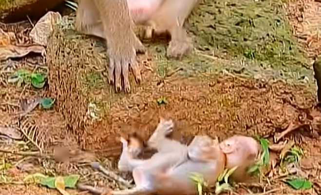 The world spun for the baby monkey. One second there was warmth and familiarity, the next there was nothing but air and fear. The baby tumbled to the ground, landing awkwardly on the damp earth. The impact wasn’t strong, but the shock was overwhelming. Confused and terrified, the baby let out a loud cry—raw, emotional, heartbreaking.