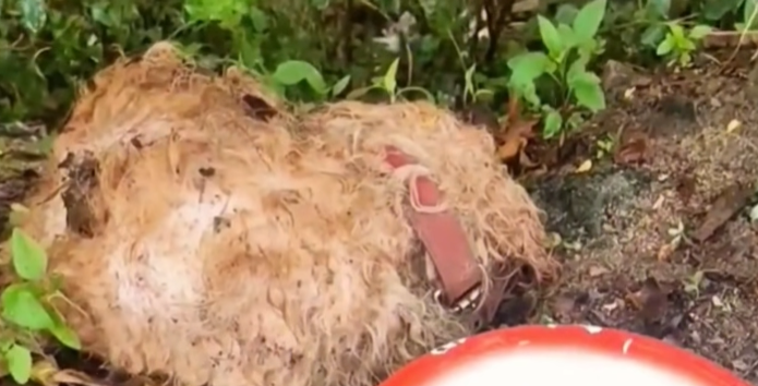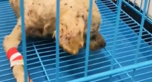 His body was thin to the point of fragility, ribs pressing sharply against his dull, dust-covered skin. One of his legs was twisted at an unnatural angle, and dried blood stained the fur around his mouth. His eyes, half-open and glassy, followed the shadows of people passing by, but there was no hope in them—only fear.