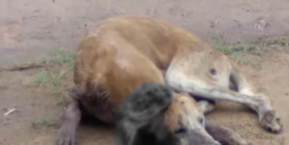 While waiting, she shaded him with her body, pouring water gently near his mouth. He licked weakly, barely able to swallow. His eyes stayed on her face, as if trying to understand why this human was different.