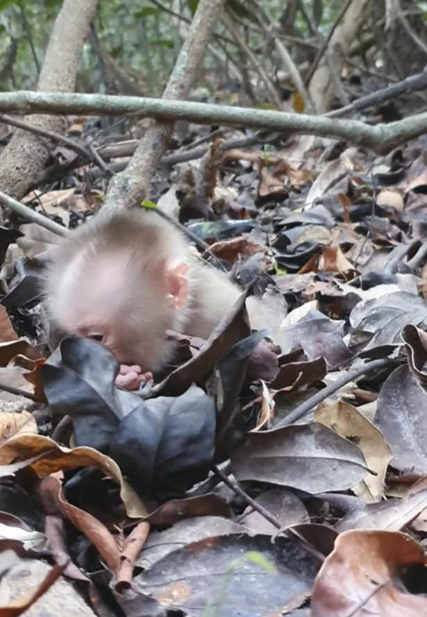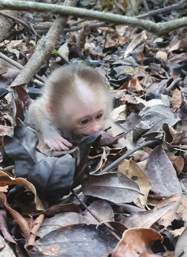 The baby monkey stays close to where he last felt her warmth. He sniffs the ground, touches nearby branches, and pauses often, listening. Every sound makes him look up quickly, hope flashing across his face for a brief moment. Then the hope fades. Silence answers him again.