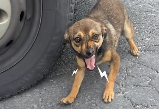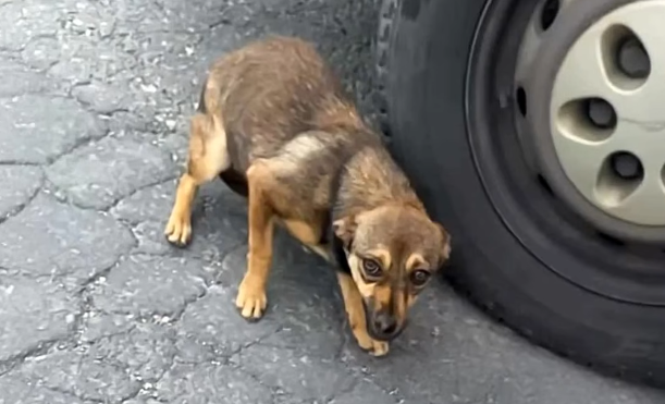 The dog backed himself into the corner of the alley, his thin body shaking uncontrollably. His ribs showed clearly beneath patchy, dirty fur. One of his ears was torn, and his tail was tucked so tightly between his legs that it almost disappeared. His eyes—wide, glassy, and filled with terror—were locked on the woman standing a few meters away.