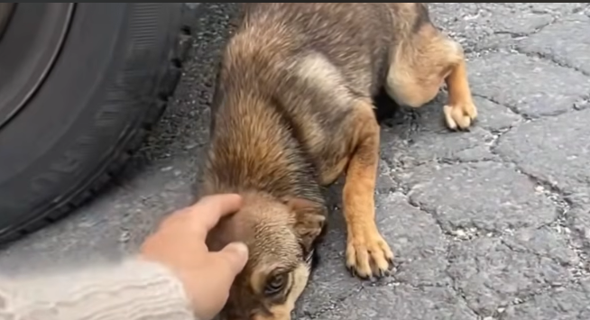 The dog let out a long, shaky breath, like he’d been holding it for years. His body collapsed onto the pavement, exhaustion finally overpowering fear. He rested his head against her leg, eyes half-closed.