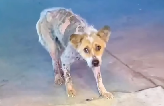 Instead, he sat completely still—frozen like a statue carved from fear and hunger—his ribs sharp beneath matted fur, his head lowered, his eyes dull and empty as if he had already accepted that the world had nothing left for him.
