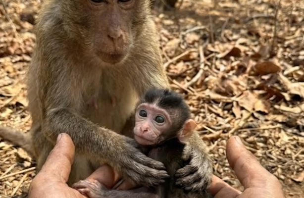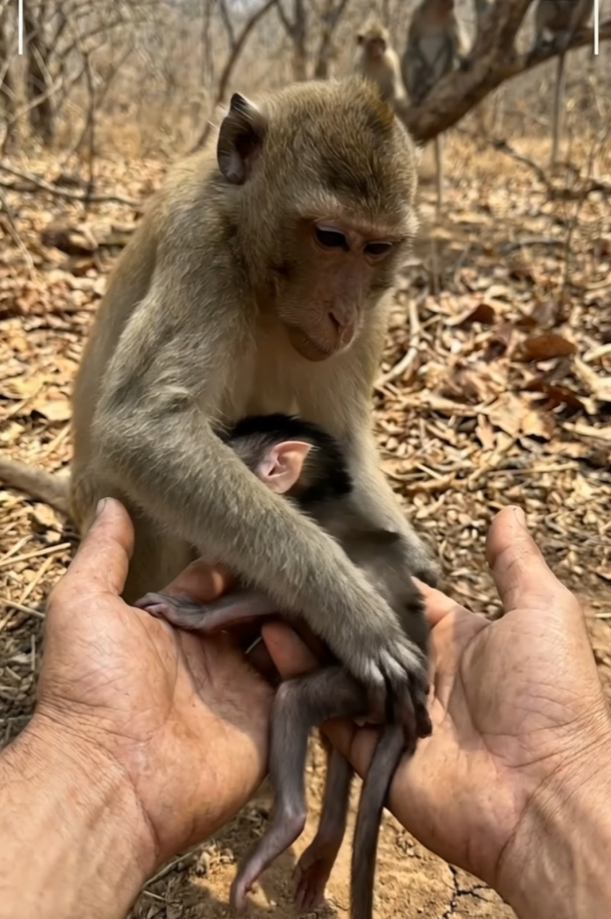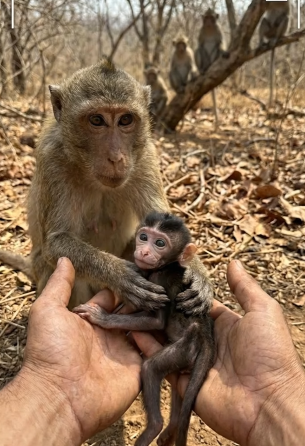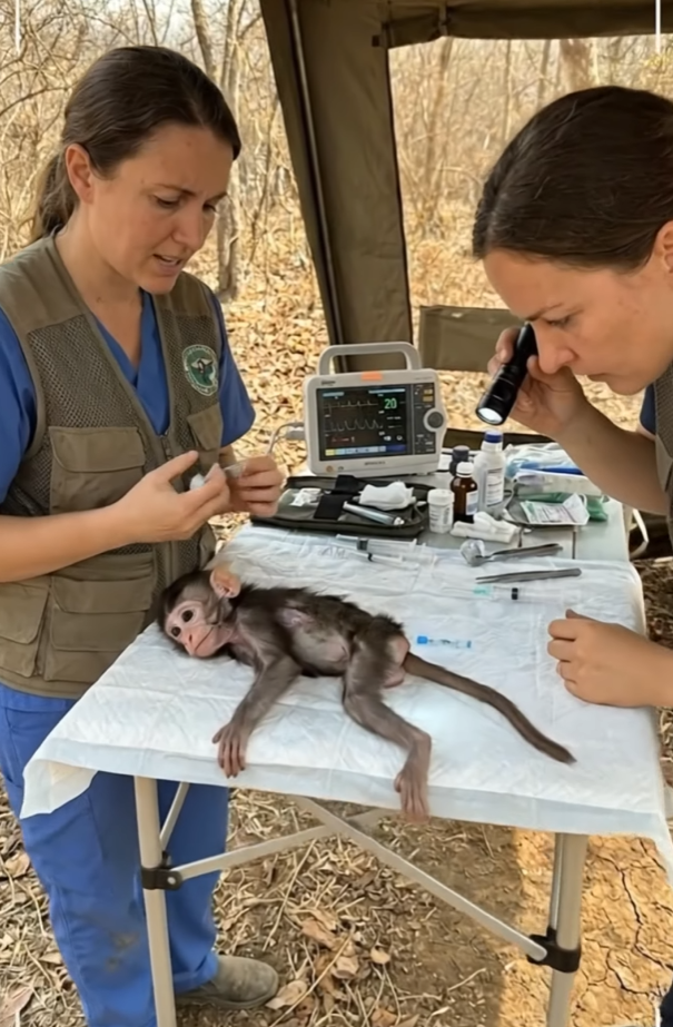 Carefully, they brought him warmth. Support. Safety. For the first time since his legs failed him, the monkey stopped crying. His breathing slowed. His eyes stayed open, watching closely, but there was something new there—relief. A fragile trust.