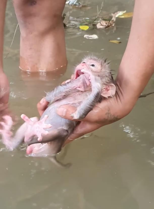 Careful hands approached him, not rushing, not grabbing. The baby monkey tensed at first, his instincts telling him to flee, but his body was too weak to run. His eyes followed every movement, searching for danger. Instead, he felt warmth. Calm. A softness he hadn’t felt since being alone. He was lifted carefully, wrapped in something clean, and held close enough to feel safe.