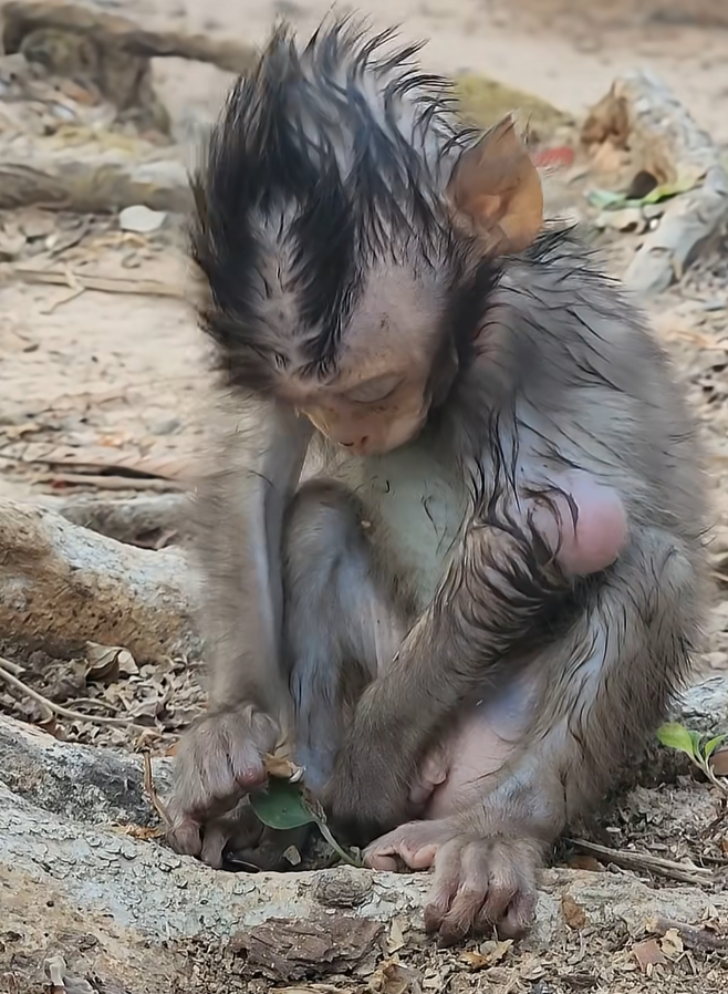 Water fascinates Jolan. After the rain, small puddles form on the ground, reflecting the sky above. Jolan leans over one carefully, staring at his own reflection. He tilts his head left, then right, watching the “other monkey” copy his movements. Confused and delighted, he reaches out and splashes the water, jumping back in surprise as droplets scatter everywhere. A moment later, he’s back at it, splashing again and again, until his fur is wet and his mother gently pulls him away.