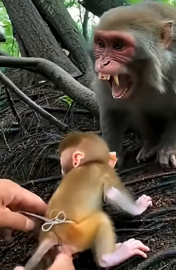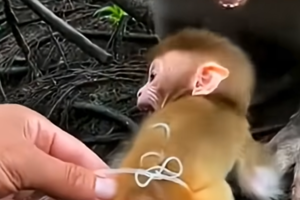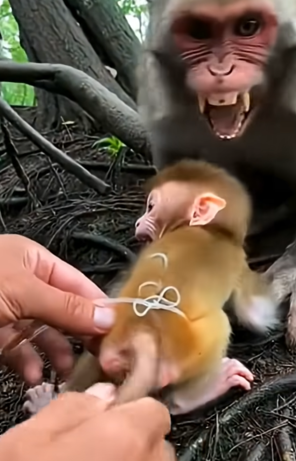 The hands tested it, just a whisper of movement. No tightening. No bite. Carefully, they lifted the line away from the monkey’s leg, millimeter by millimeter. When it finally came free, the monkey flinched—not from pain, but from surprise. He looked down, lifting his leg slightly, then setting it back down again, unsure if the danger was truly gone.