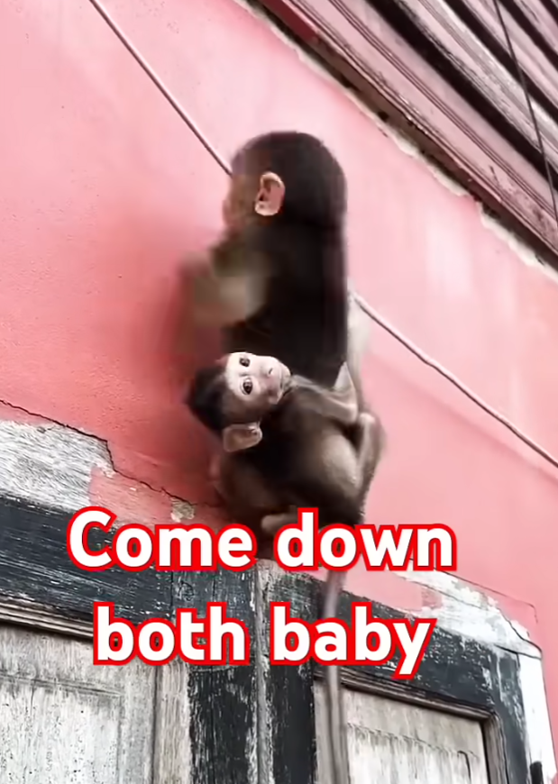 They were small—so small that their fingers looked like delicate twigs curled around their mother’s fur. The older one opened his eyes first, dark and curious, blinking as the sky slowly changed color. Beside him, the younger baby monkey slept on, his chest rising and falling in soft, uneven breaths. He let out a quiet squeak, as if dreaming of milk and comfort.