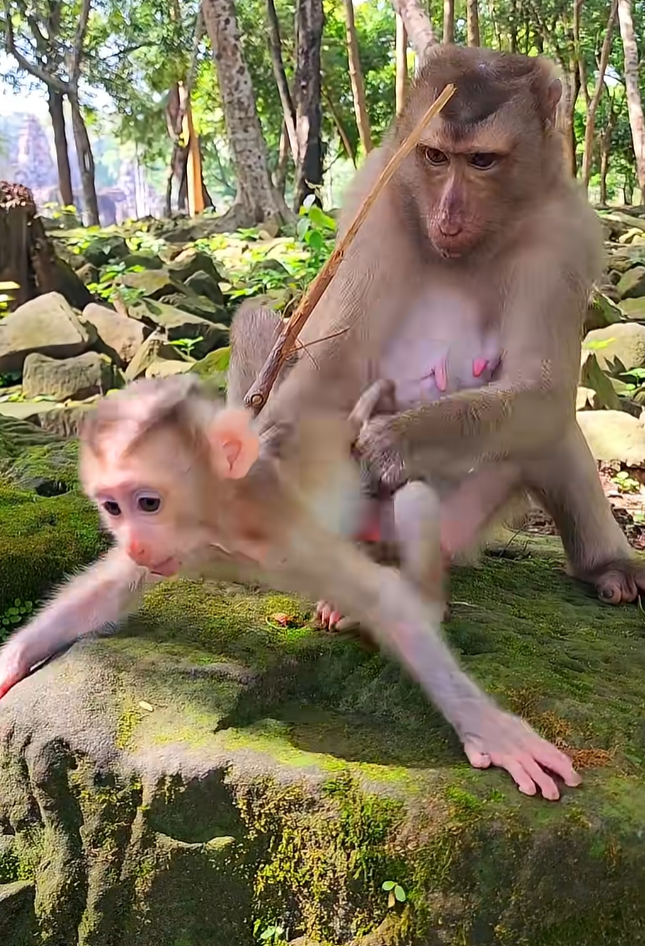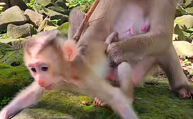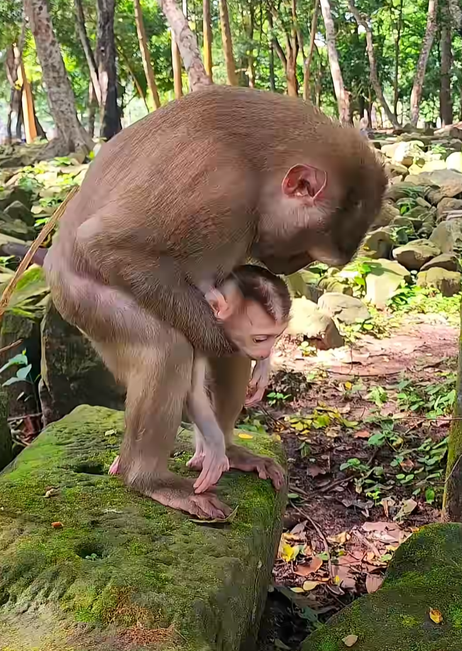 Adorable Julie acts loves cute baby not with grand gestures, but with constant attention. She cleaned his fur carefully, picking away tiny bits of leaf and dirt. She guided his hands when they slipped. She watched his face closely, learning every expression—every sign of hunger, discomfort, or curiosity.